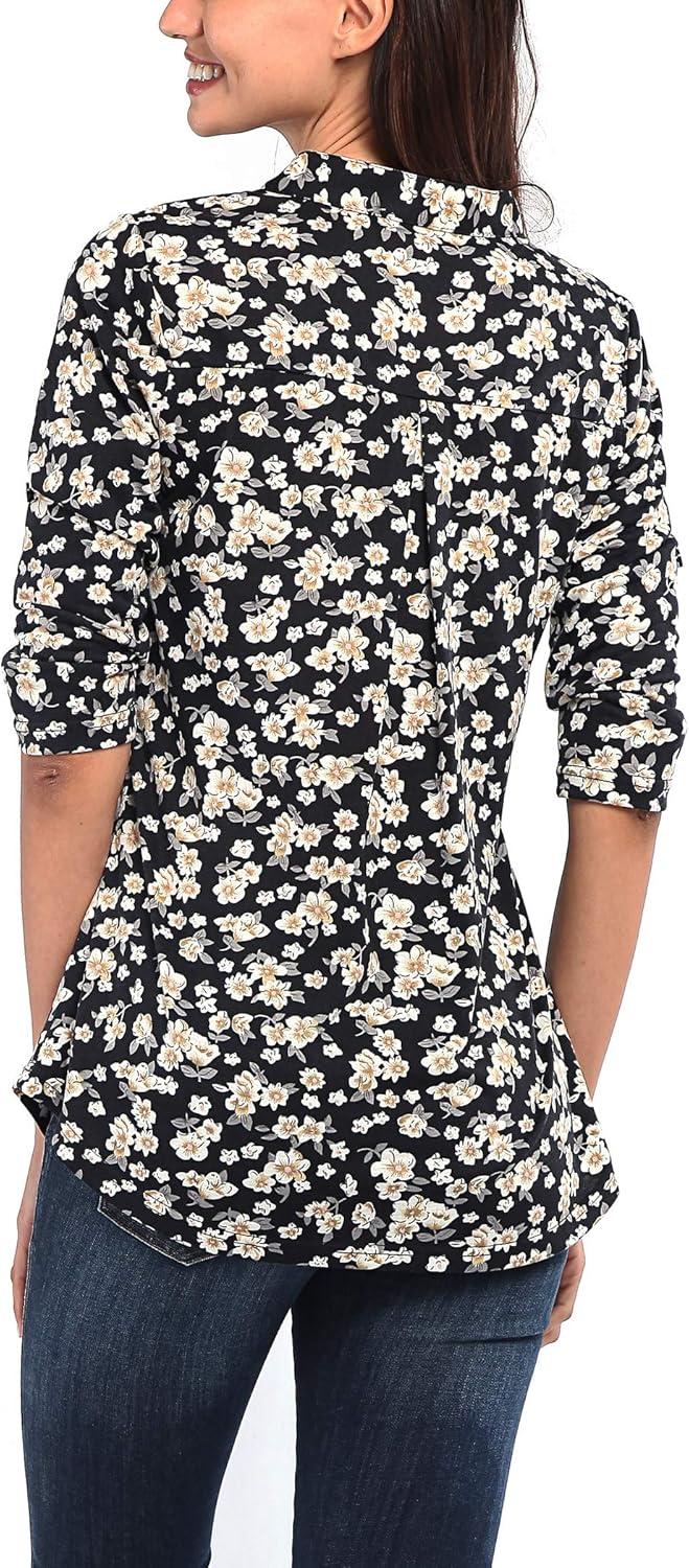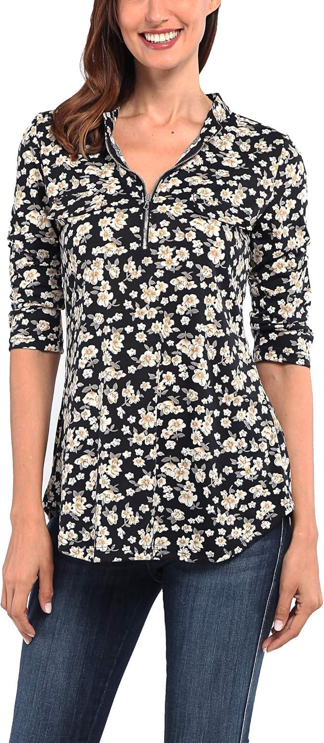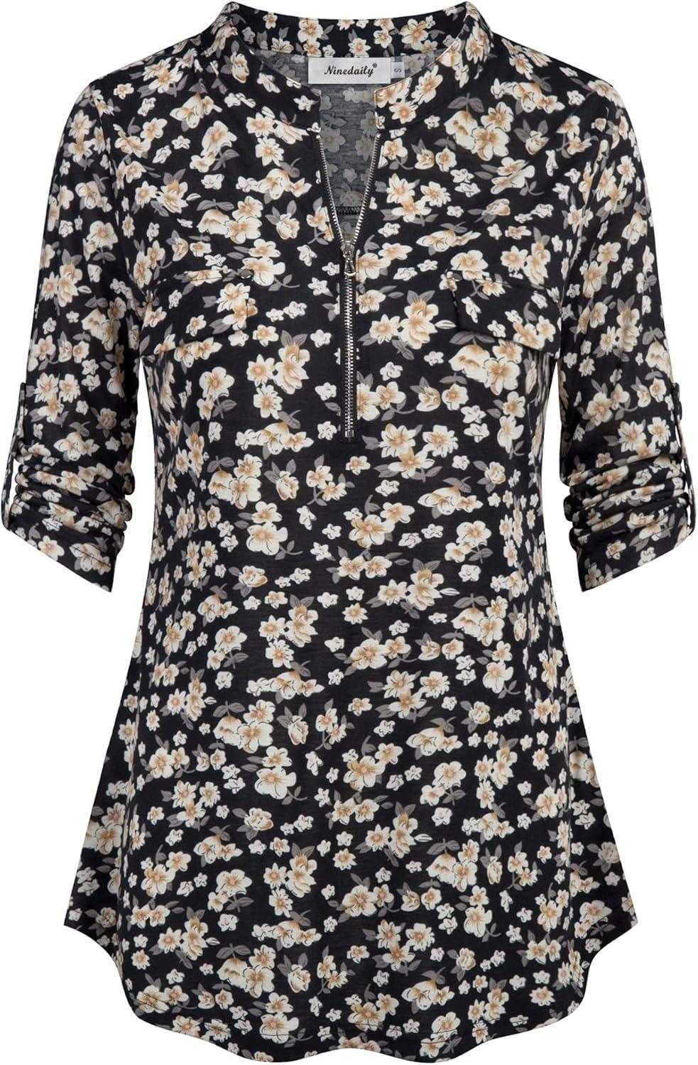 Ninedaily Women’s 3/4 Sleeve Plaid Shirts Zip Floral Casual Tunic Blouse Tops(Blackbeige)