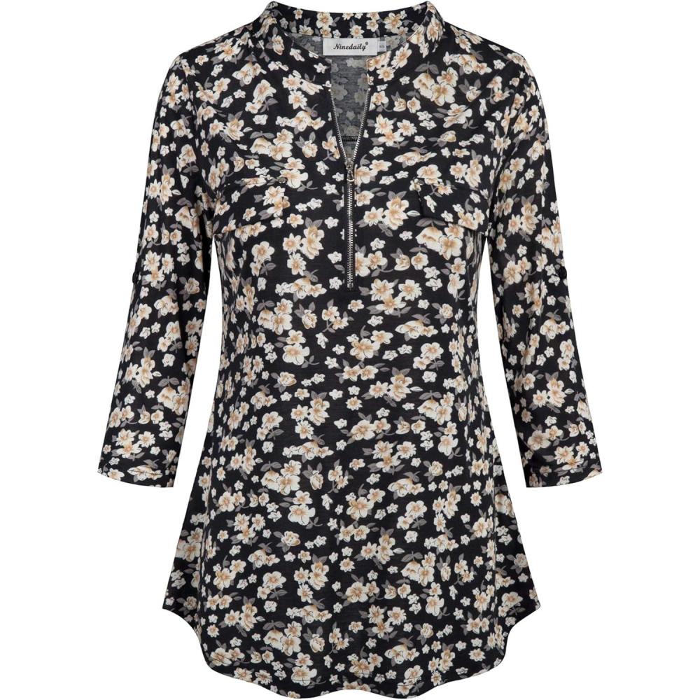 imageNinedaily Womens 34 Sleeve Plaid Shirts Zip Floral Casual Tunic Blouse TopsBlackbeige