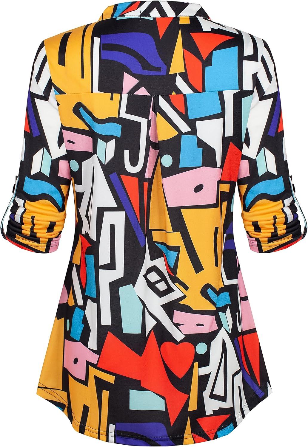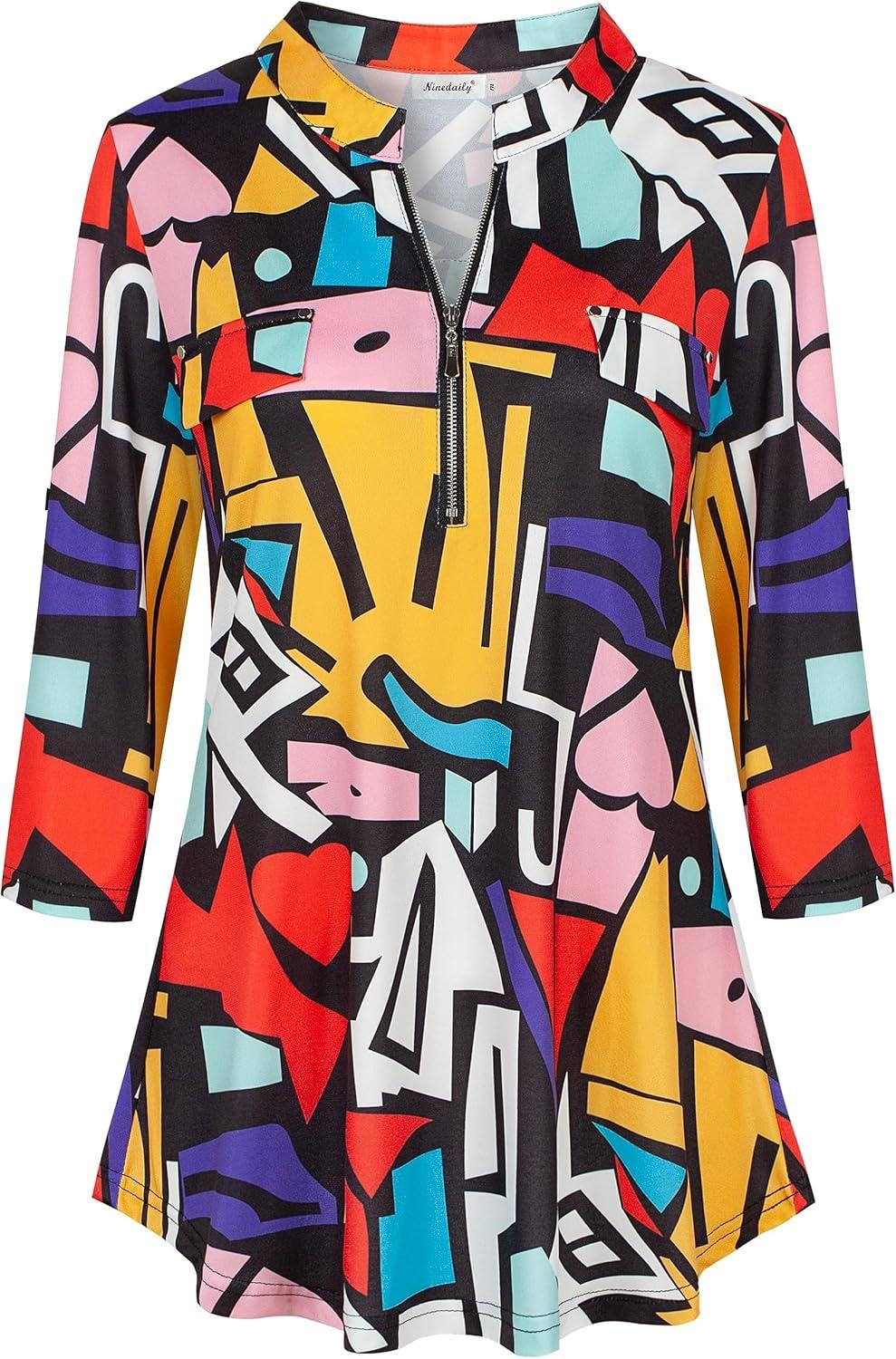 Ninedaily Women’s 3/4 Sleeve Plaid Shirts Zip Floral Casual Tunic Blouse Tops(Multicolored)