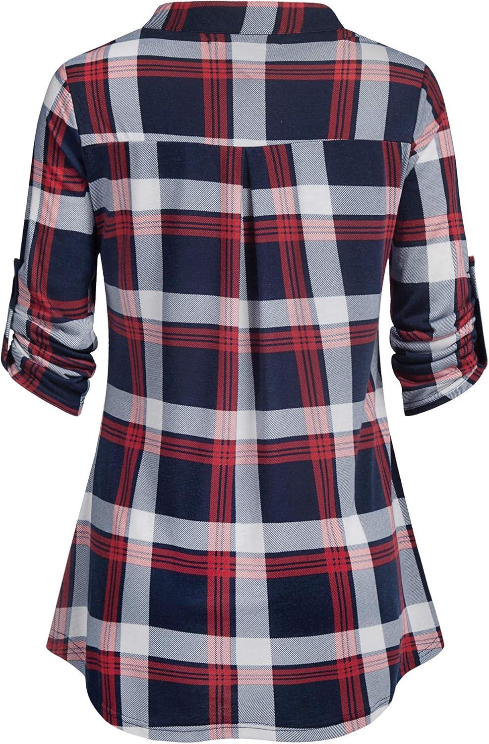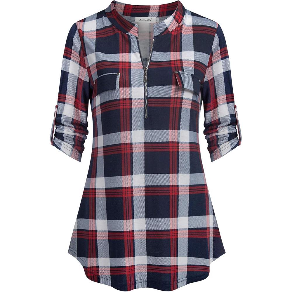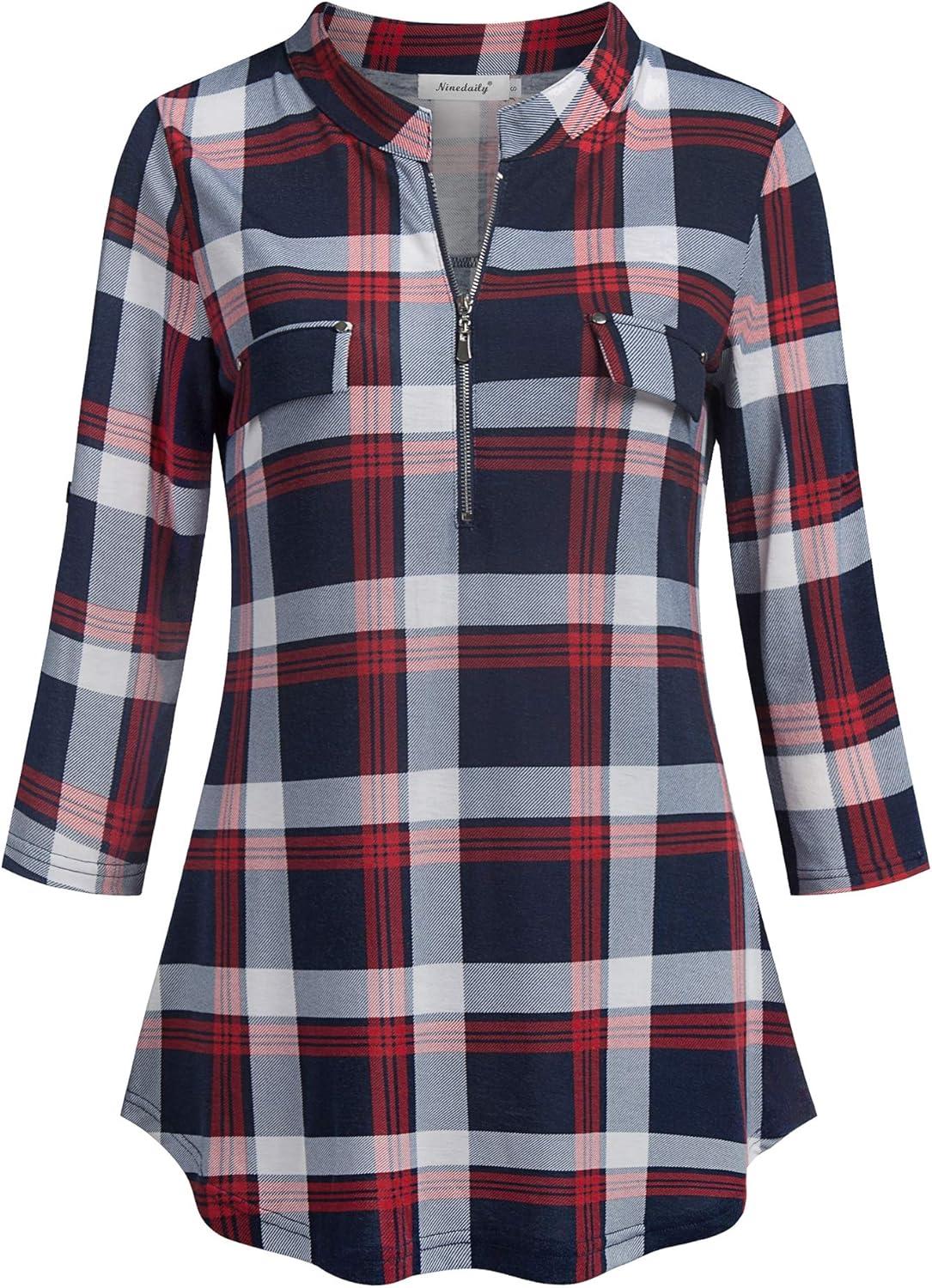 Ninedaily Women’s 3/4 Sleeve Plaid Shirts Zip Floral Casual Tunic Blouse Tops(Navywhitered Plaid)