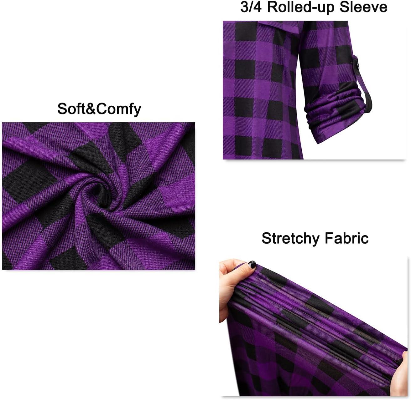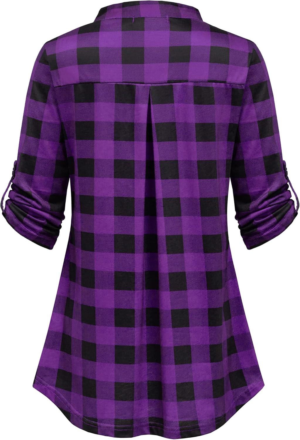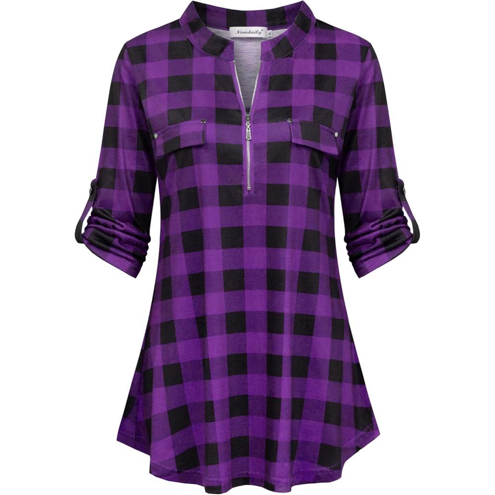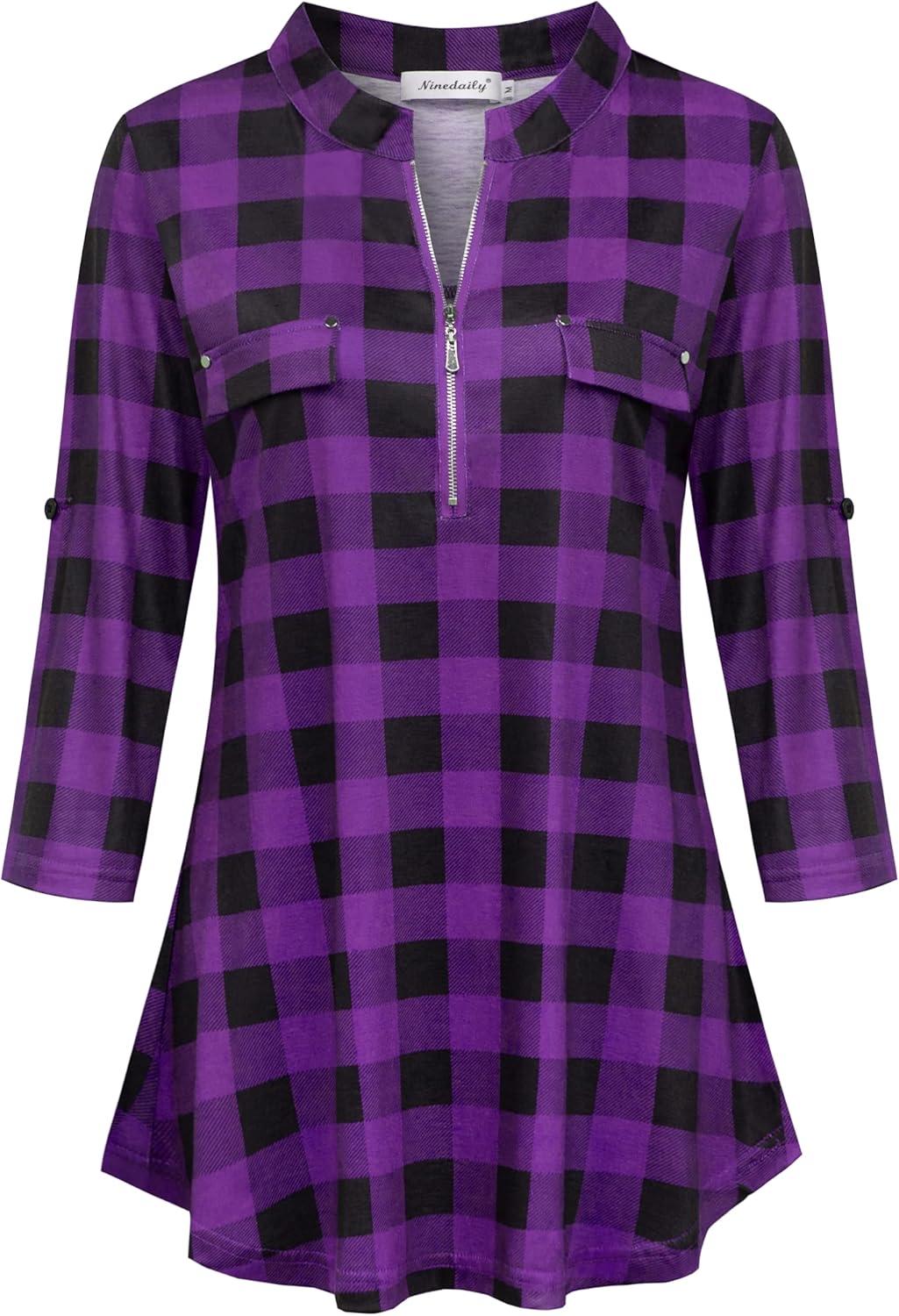 Ninedaily Women’s 3/4 Sleeve Plaid Shirts Zip Floral Casual Tunic Blouse Tops(Purple Plaid)
