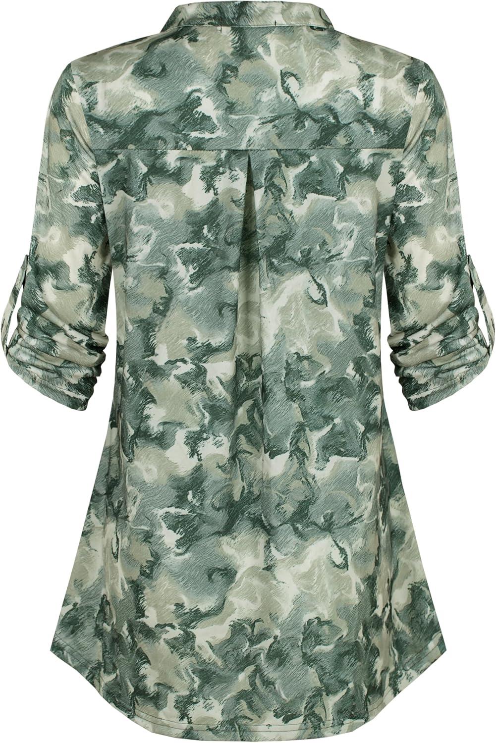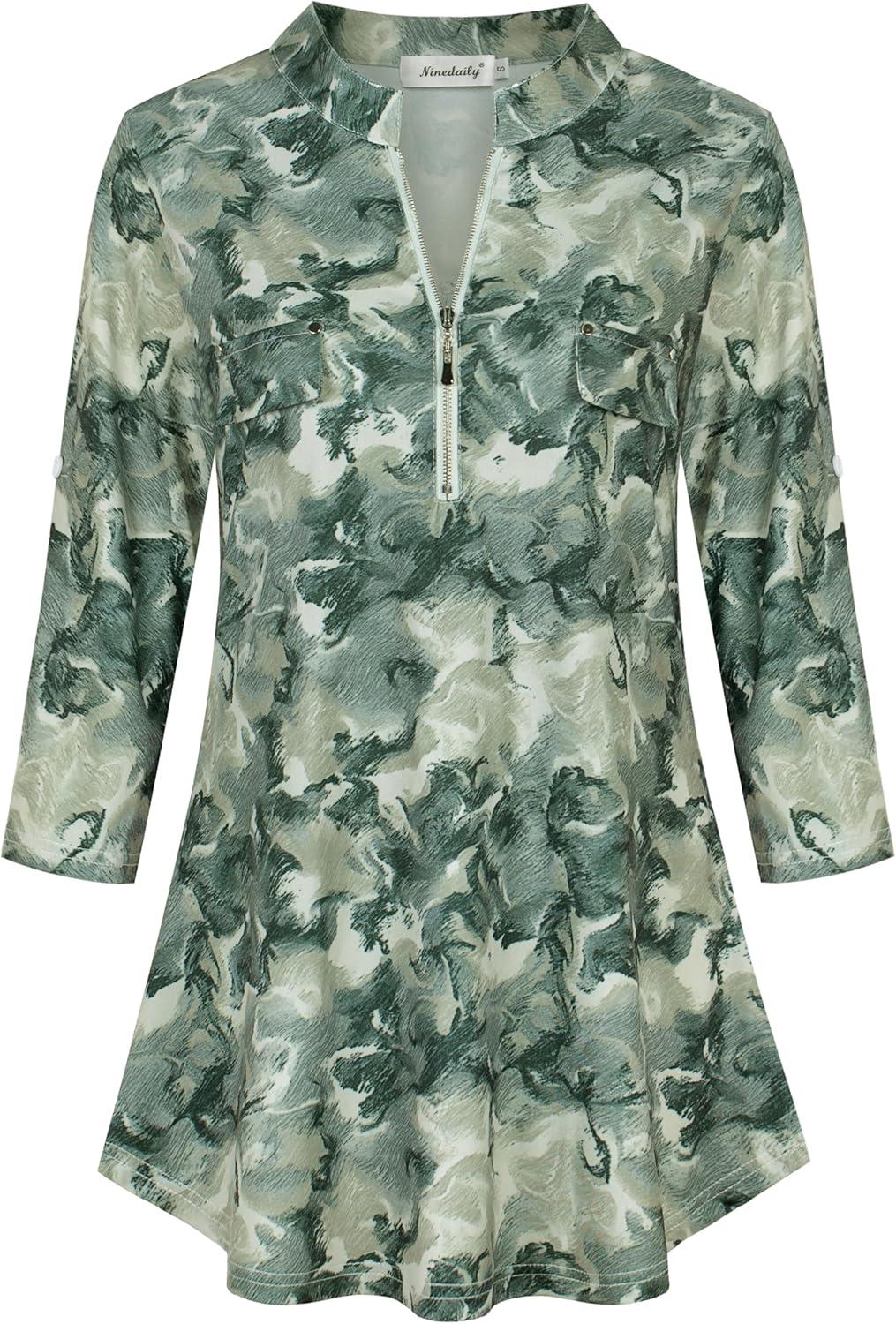 Ninedaily Women’s 3/4 Sleeve Plaid Shirts Zip Floral Casual Tunic Blouse Tops(Tie Dye Green)