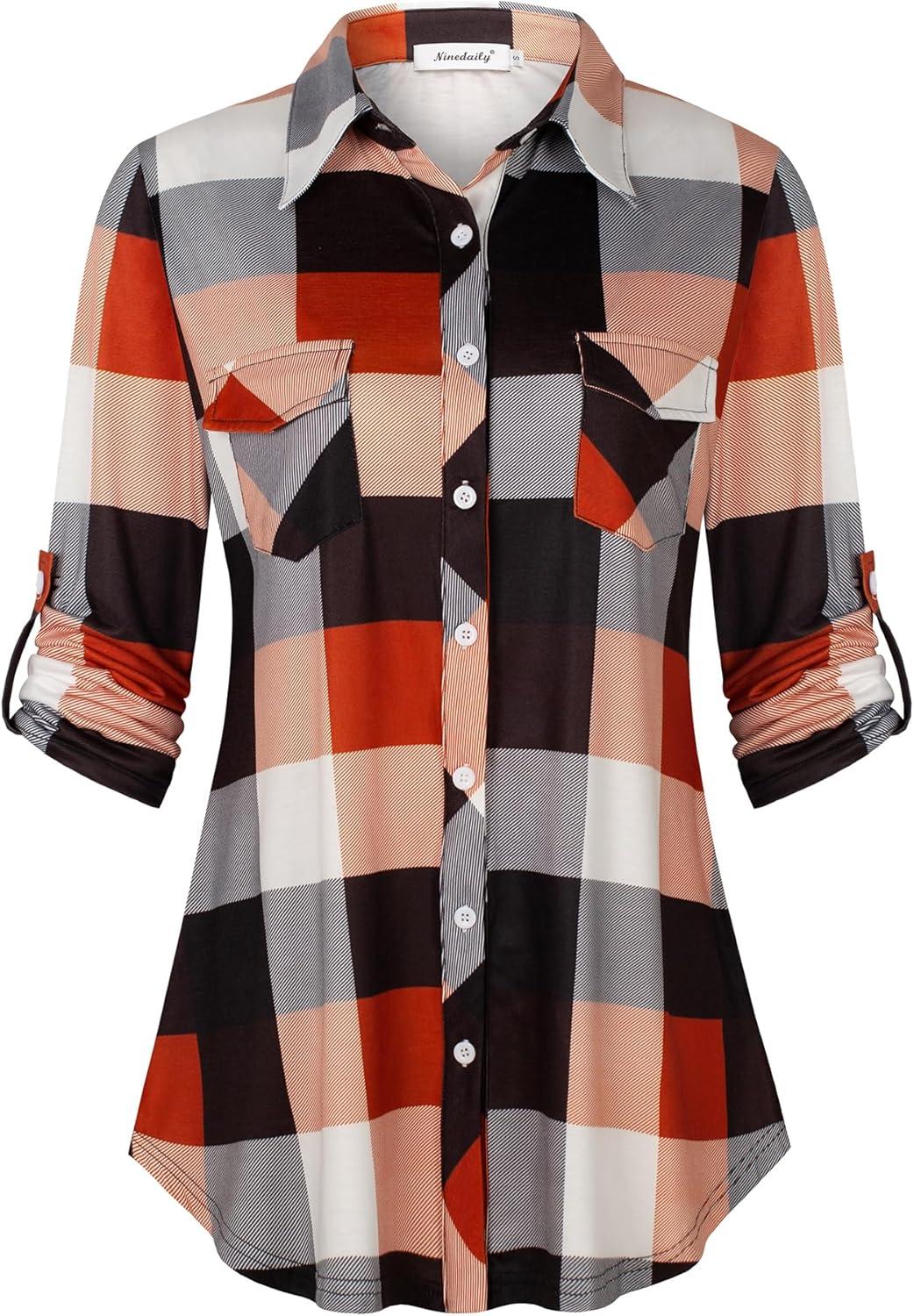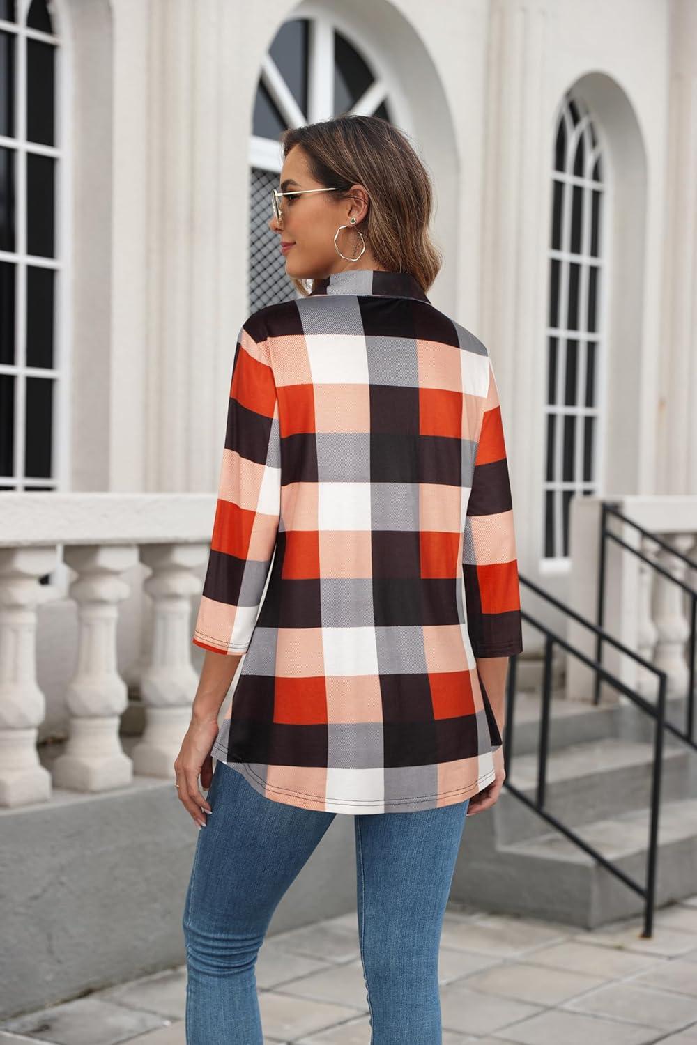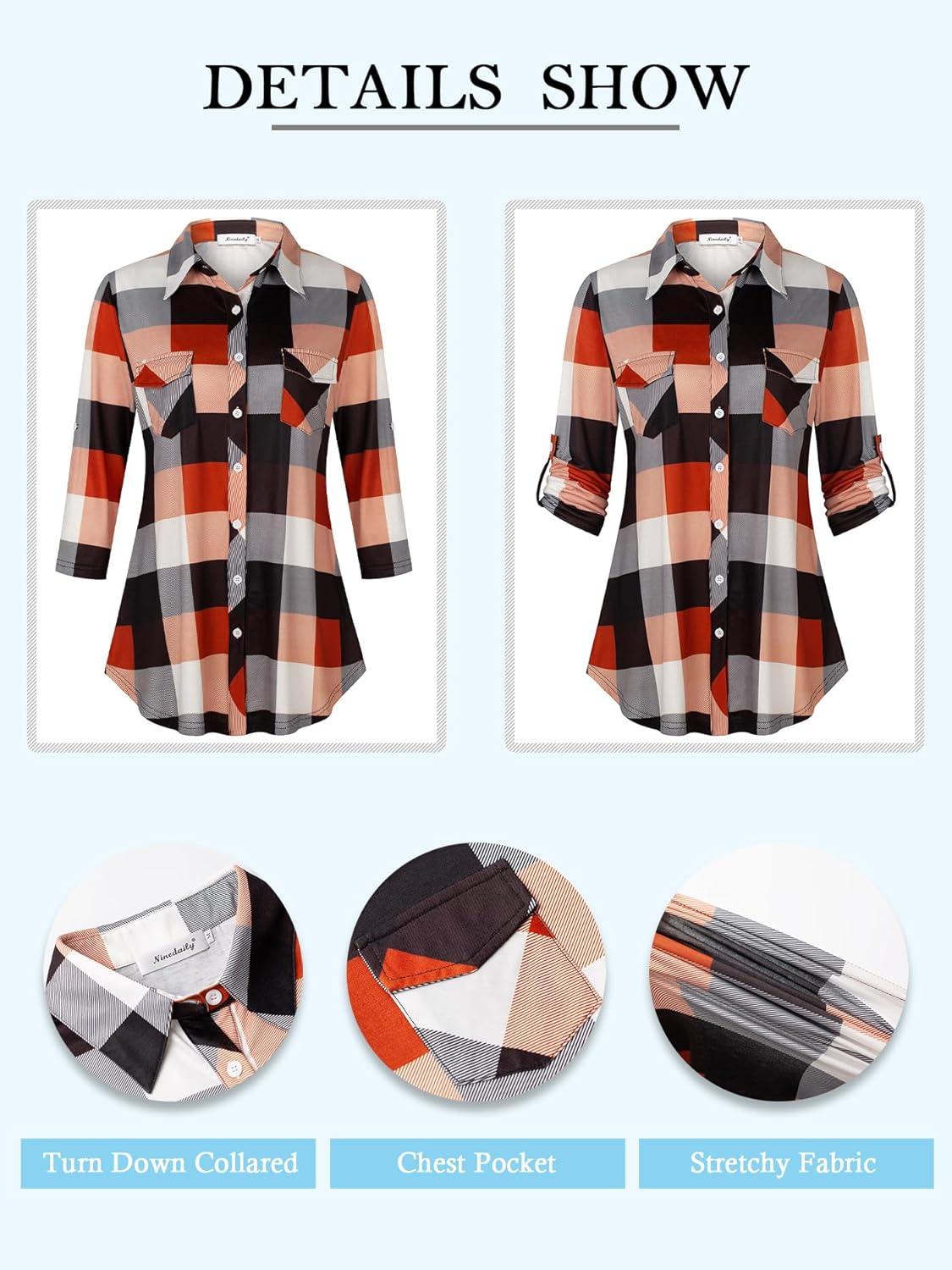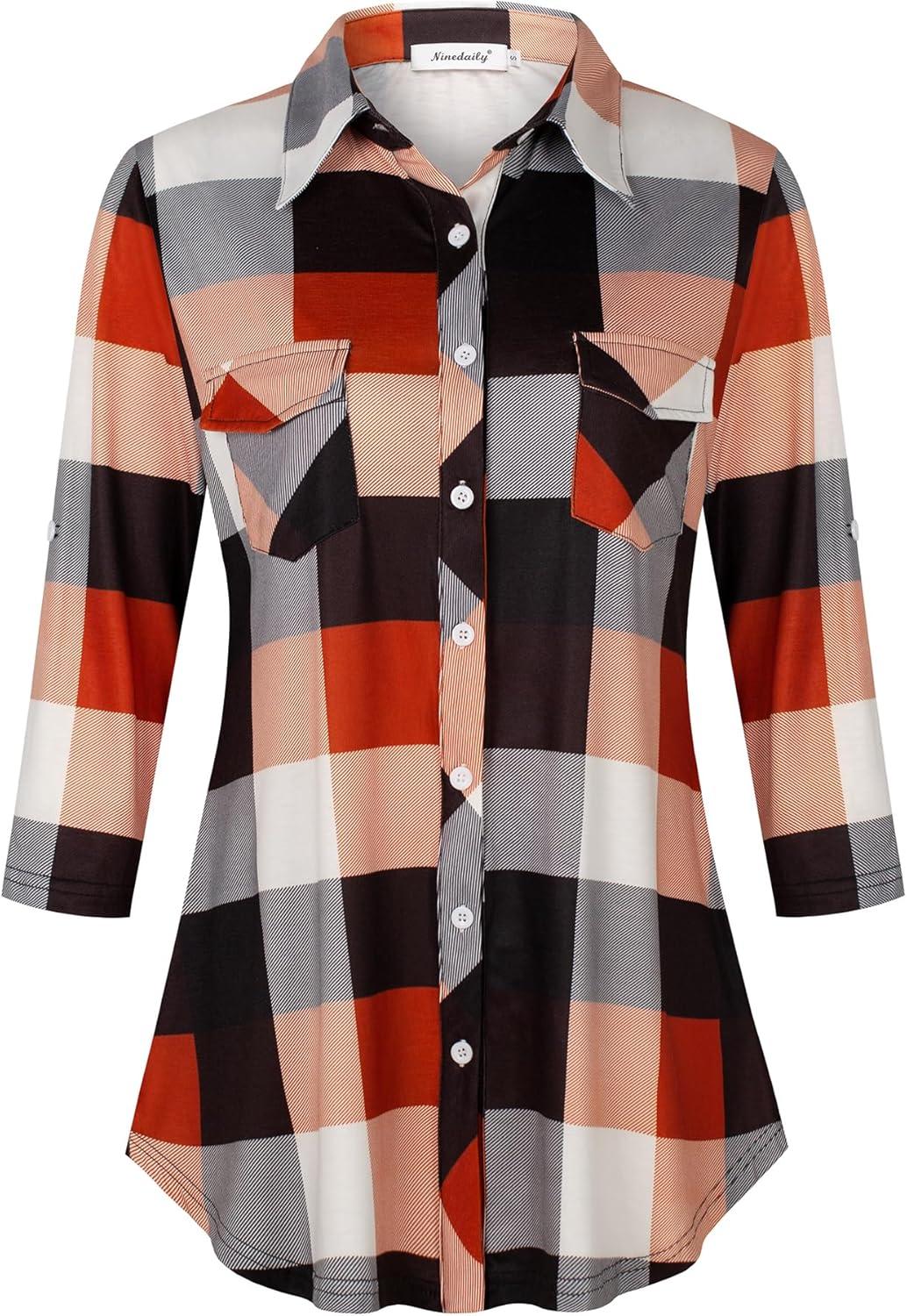Ninedaily Women’s Plaid Shirt Collared Button Down Blouse 3/4 Sleeve Tunic Tops(Orange)