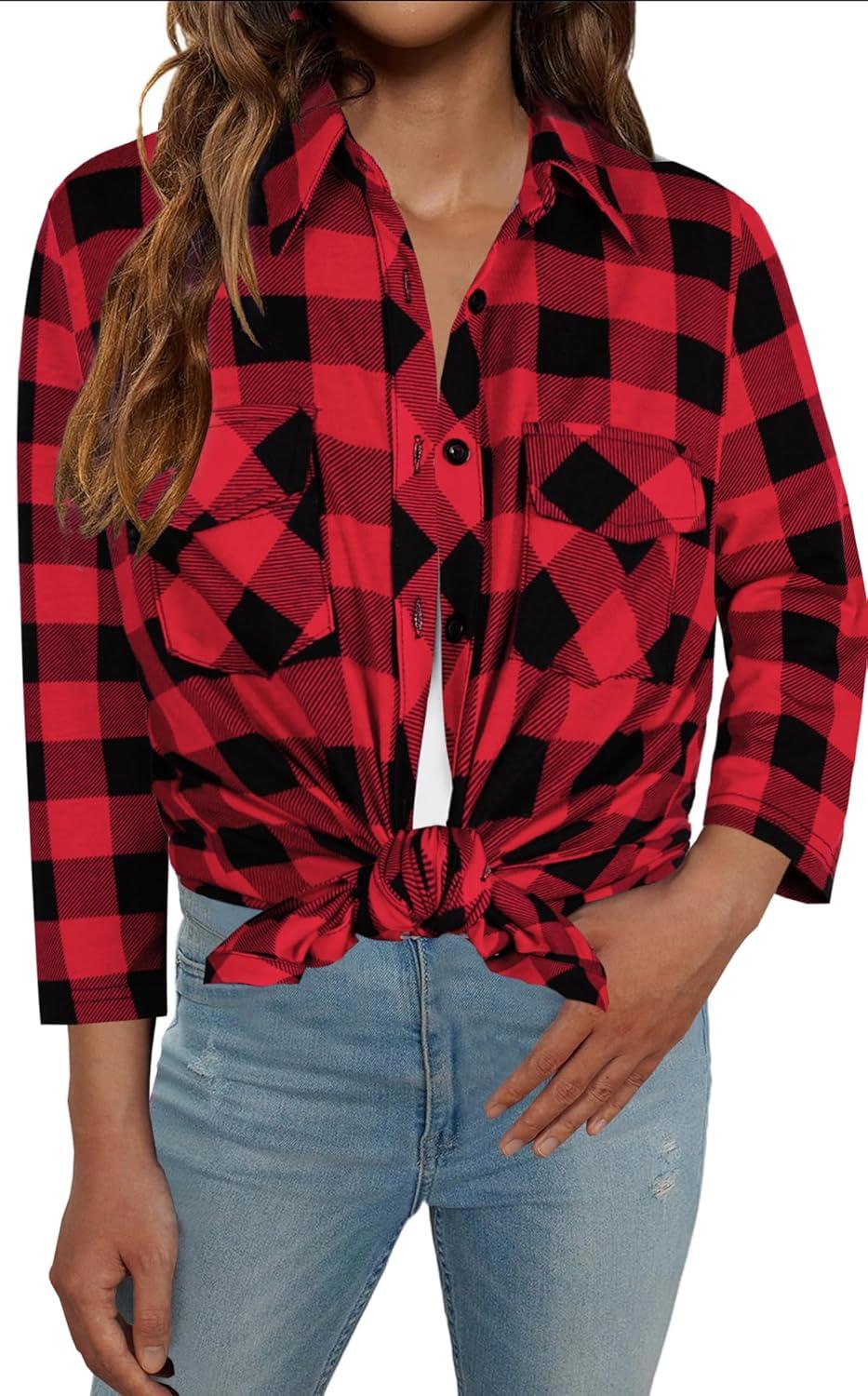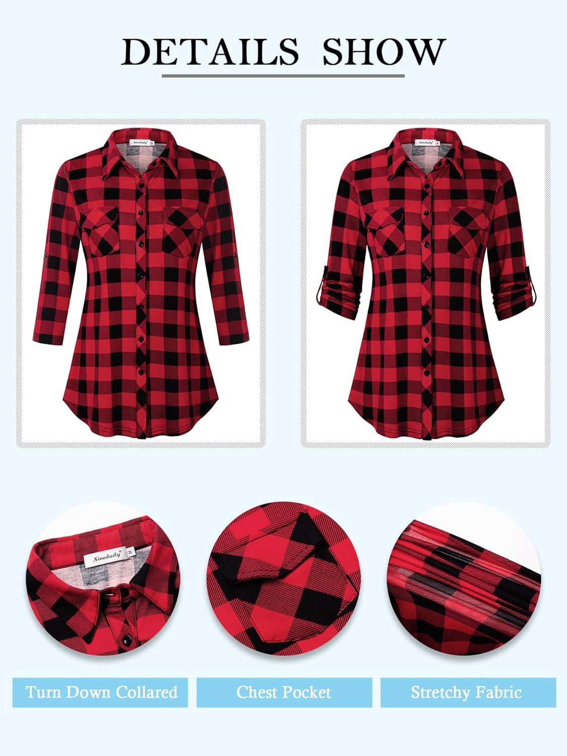Ninedaily Women’s Plaid Shirt Collared Button Down Blouse 3/4 Sleeve Tunic Tops(Red)