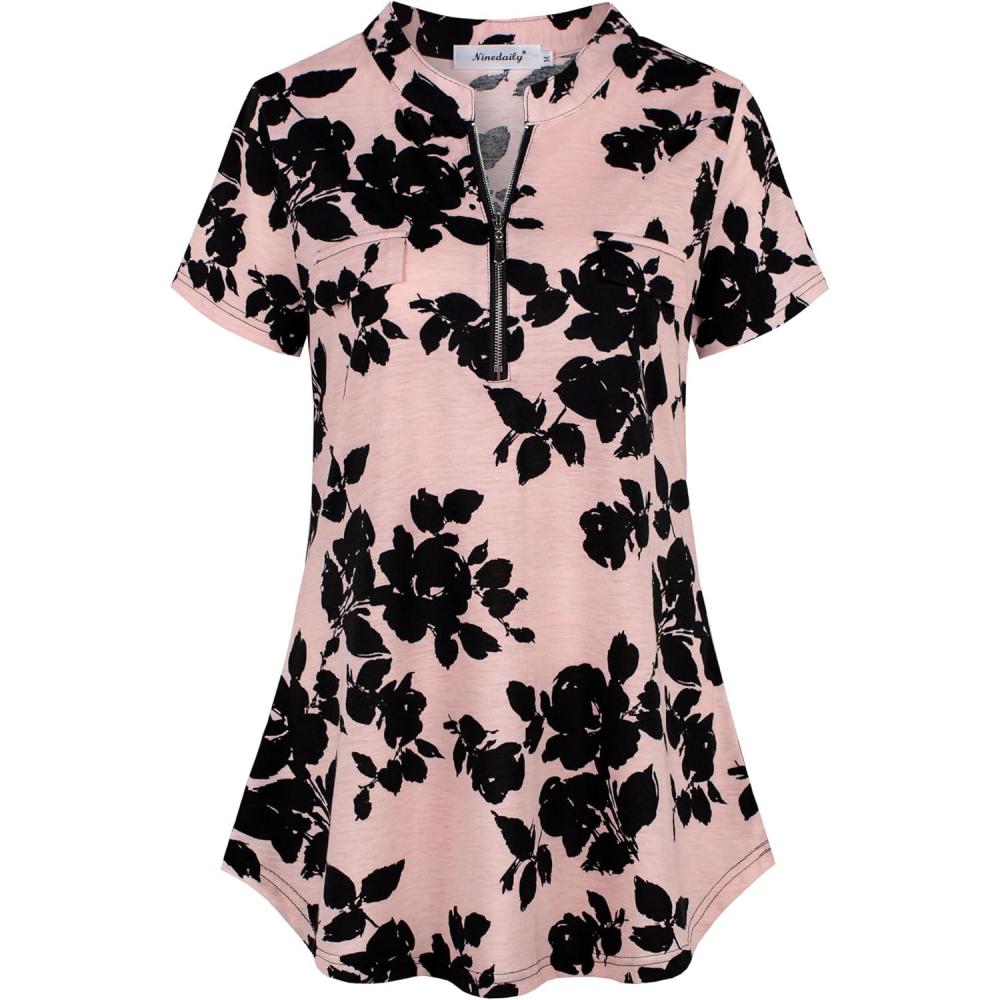 Ninedaily Women’s Summer Tops Short Sleeve Casual Blouse Zip Floral Tunic Shirts(Black Floral)
