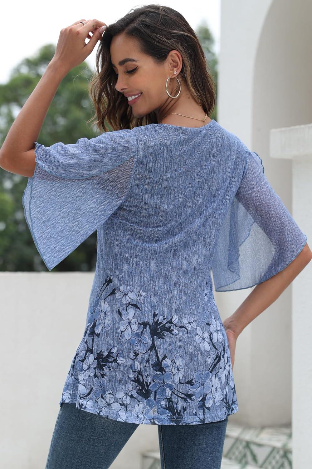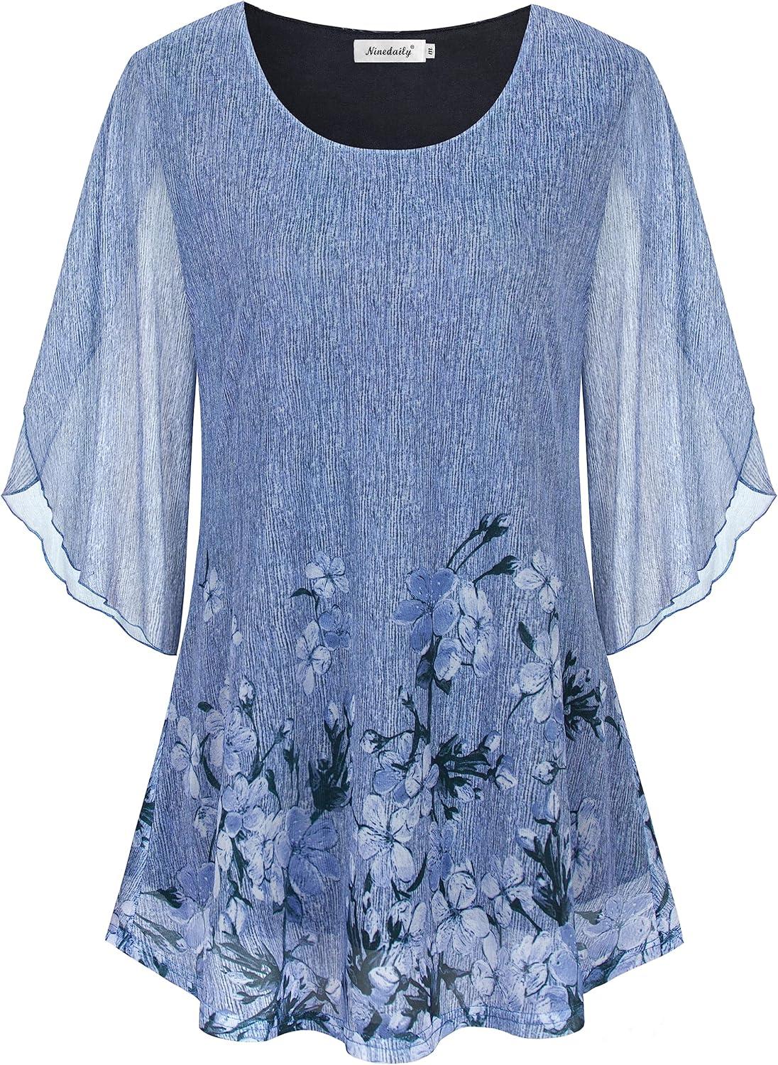 Ninedaily Women’s Tops 3/4 Sleeve Blouses Dressy Casual Double Layers Mesh Tunic Shirts(Blue Floral)