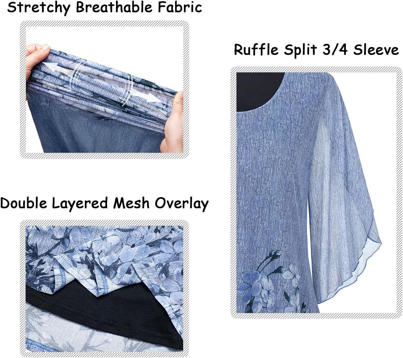 Ninedaily Women's Tops 3/4 Sleeve Blouses Dressy Casual Double Layers Mesh Tunic Shirts(Blue Floral)