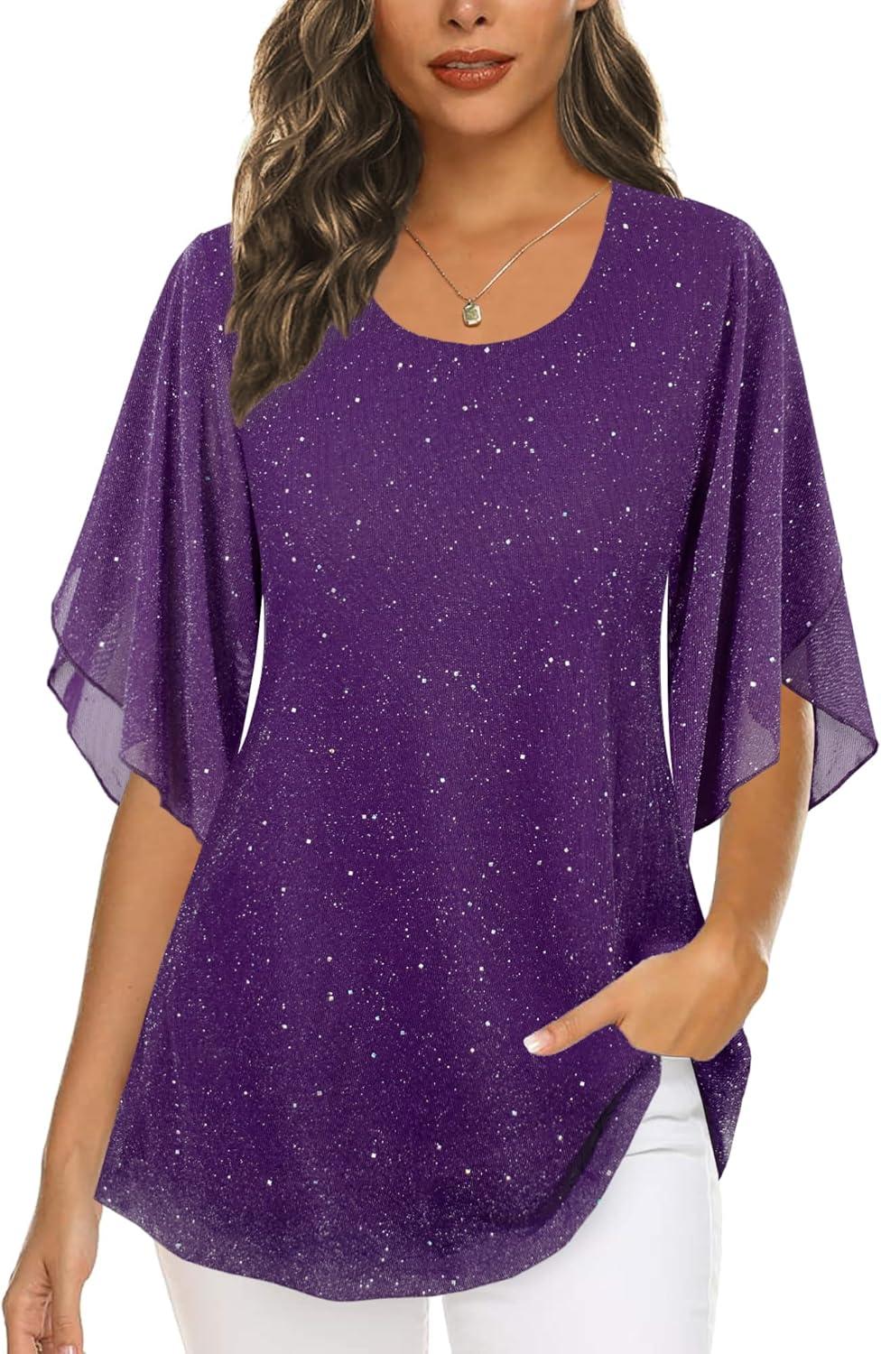 Ninedaily Women’s Tops 3/4 Sleeve Blouses Dressy Casual Double Layers Mesh Tunic Shirts(Sparkly Purple)