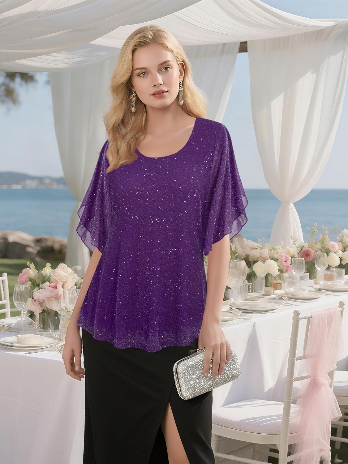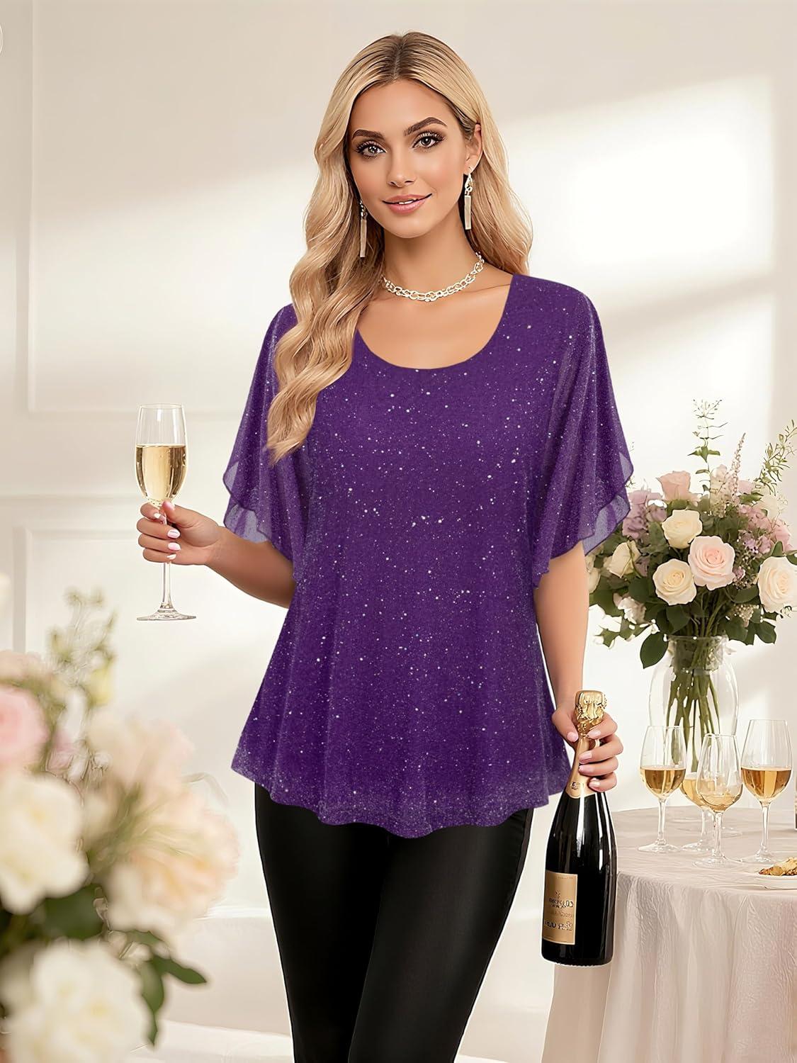 Ninedaily Women's Tops 3/4 Sleeve Blouses Dressy Casual Double Layers Mesh Tunic Shirts(Sparkly Purple)