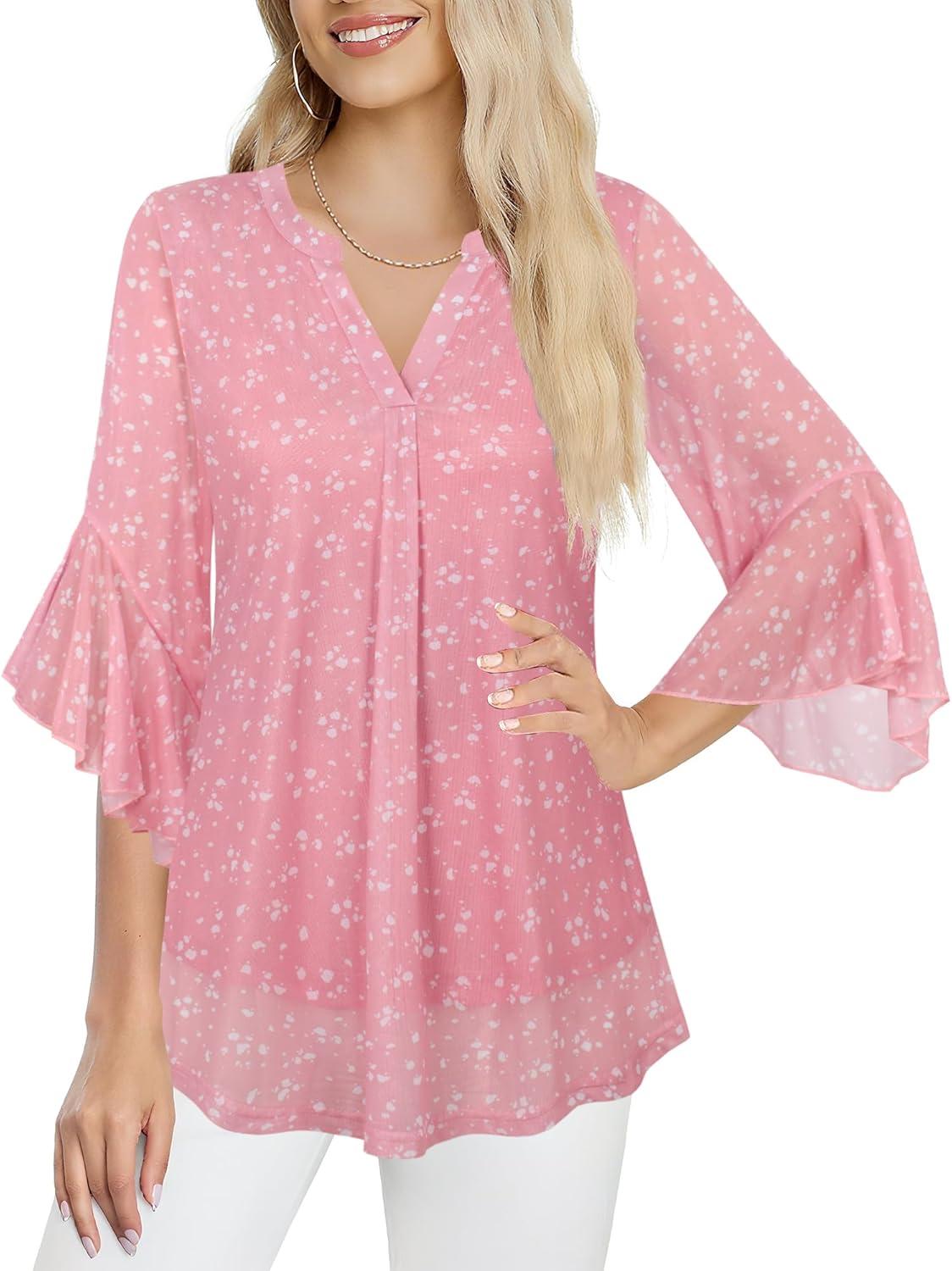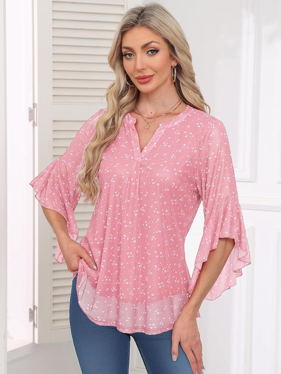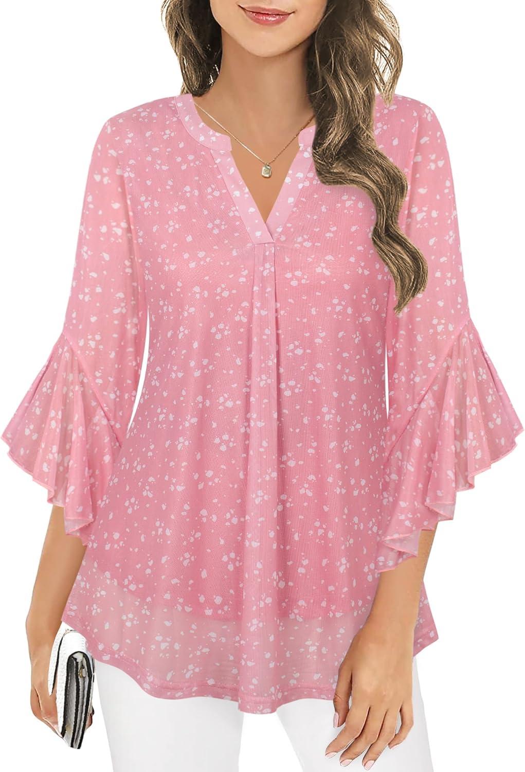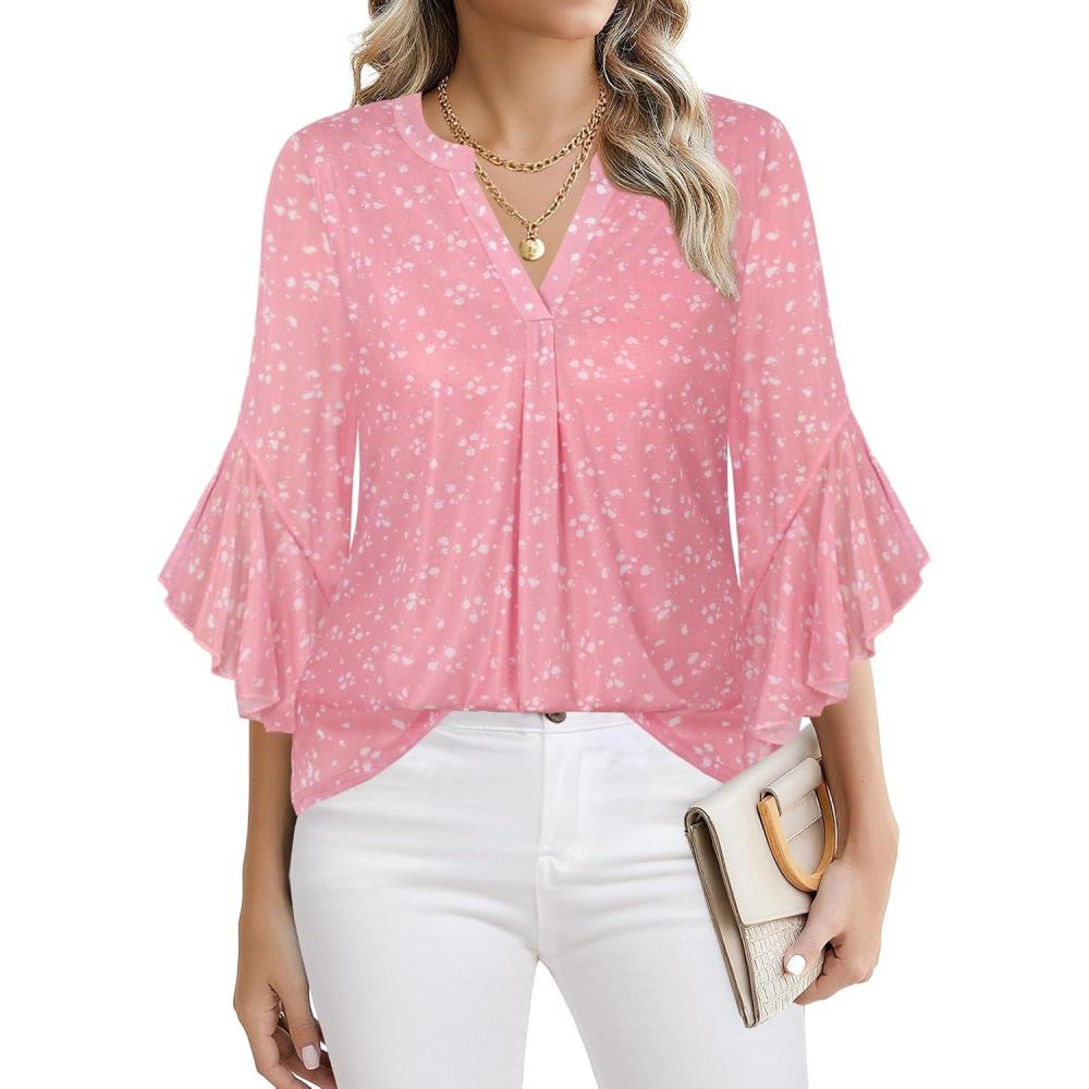 Ninedaily Womens Tops 3/4 Sleeve Dressy Casual Blouses Double Layers V Neck Shirt(Floral Pink)