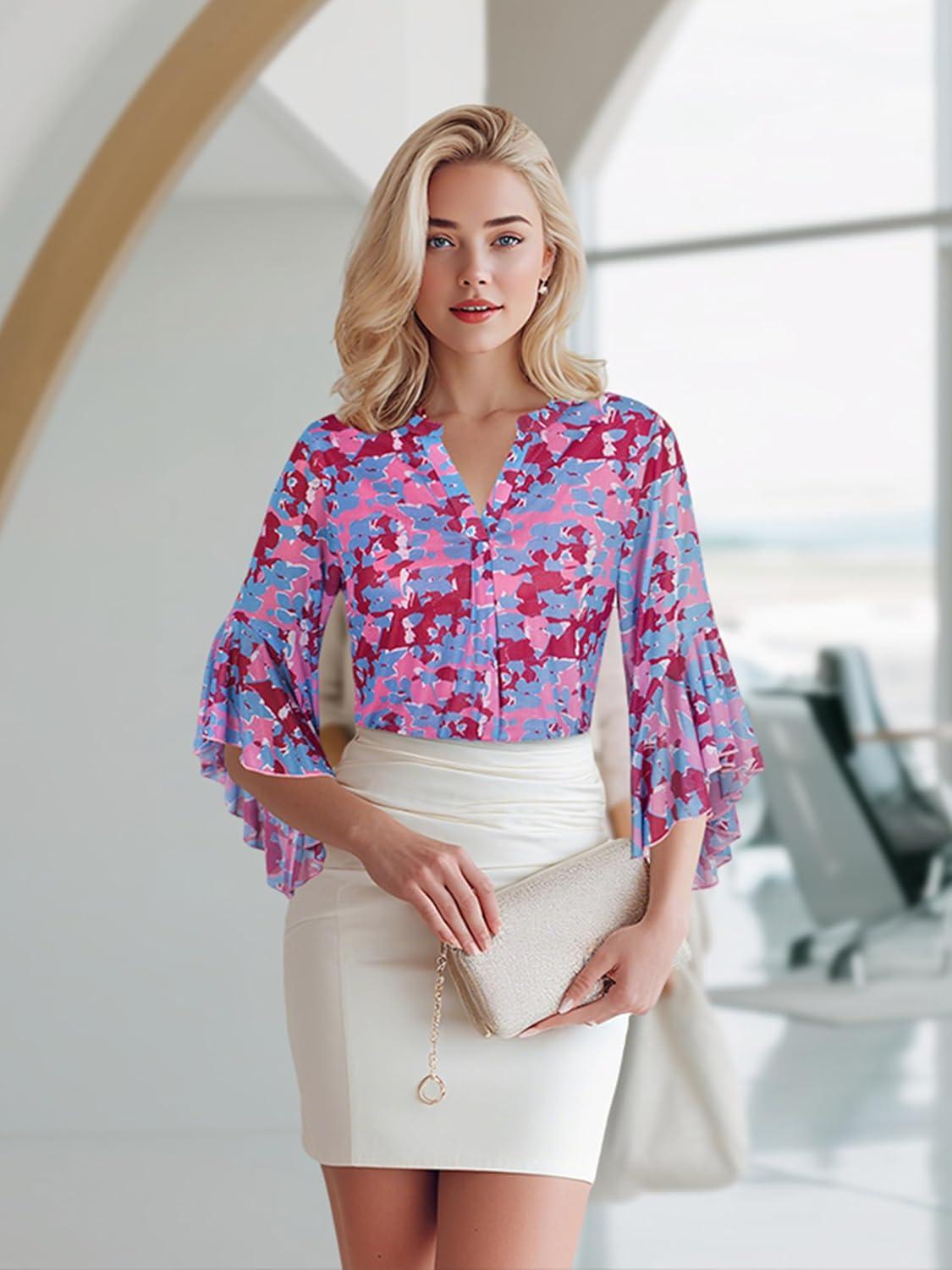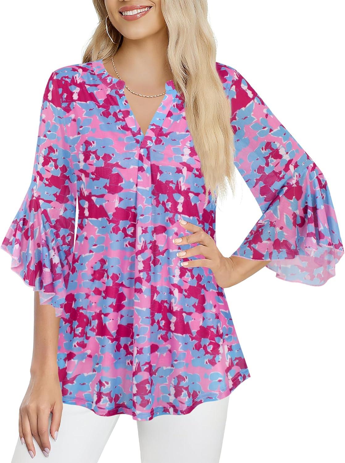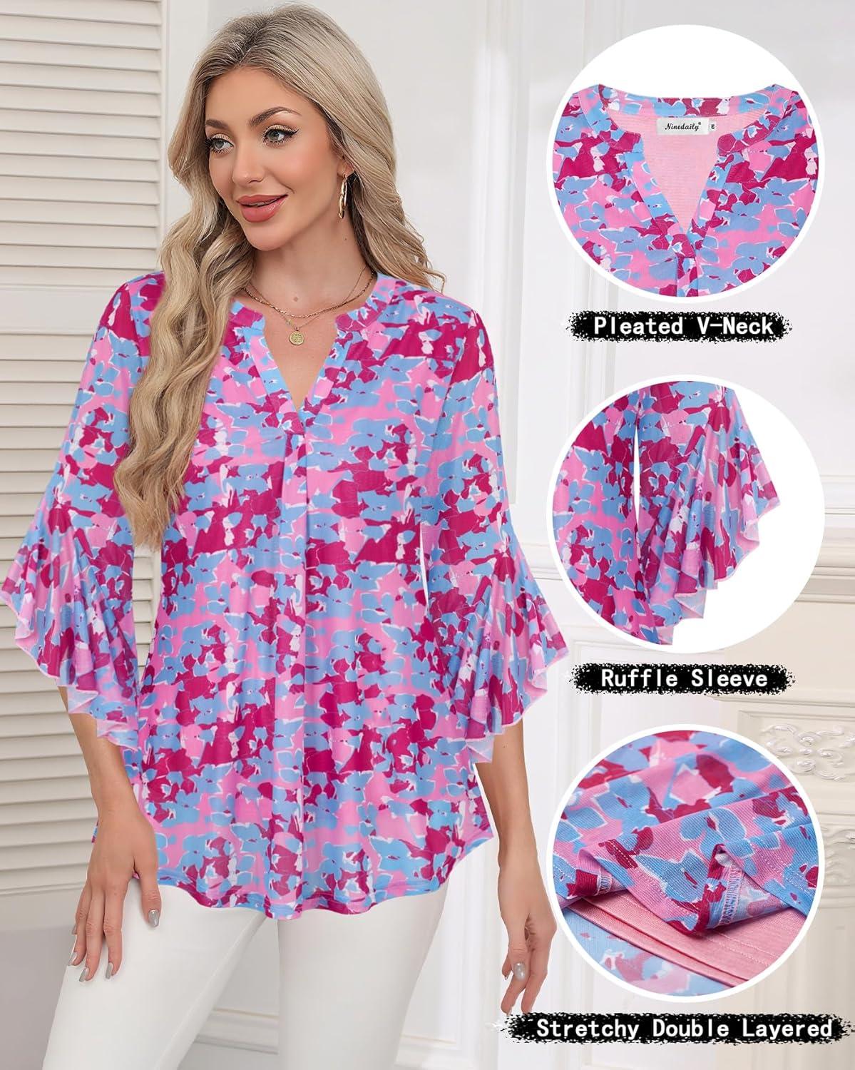 Ninedaily Womens Tops 3/4 Sleeve Dressy Casual Blouses Double Layers V Neck Shirt(Multicolor)
