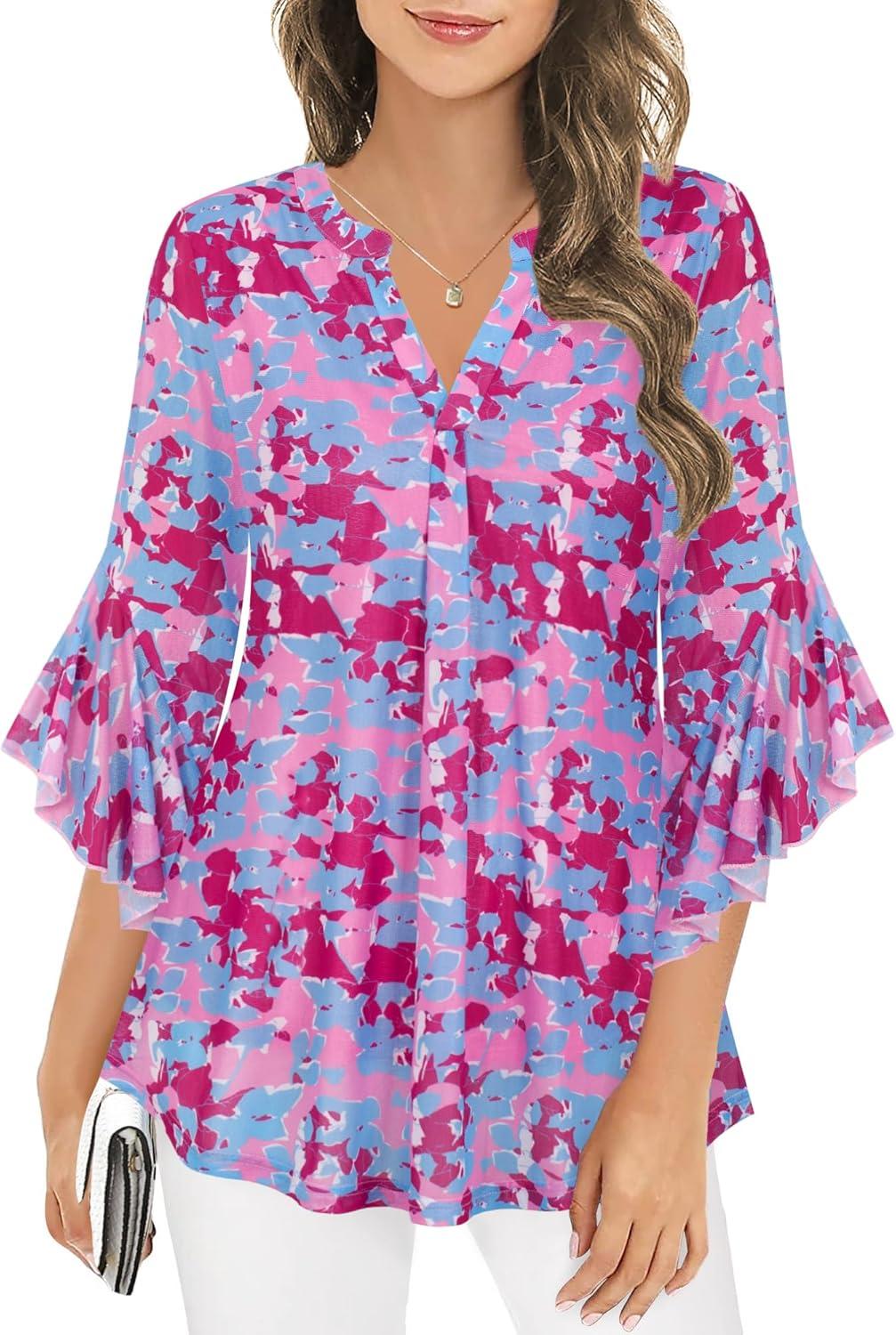 Ninedaily Womens Tops 3/4 Sleeve Dressy Casual Blouses Double Layers V Neck Shirt(Floral Red)