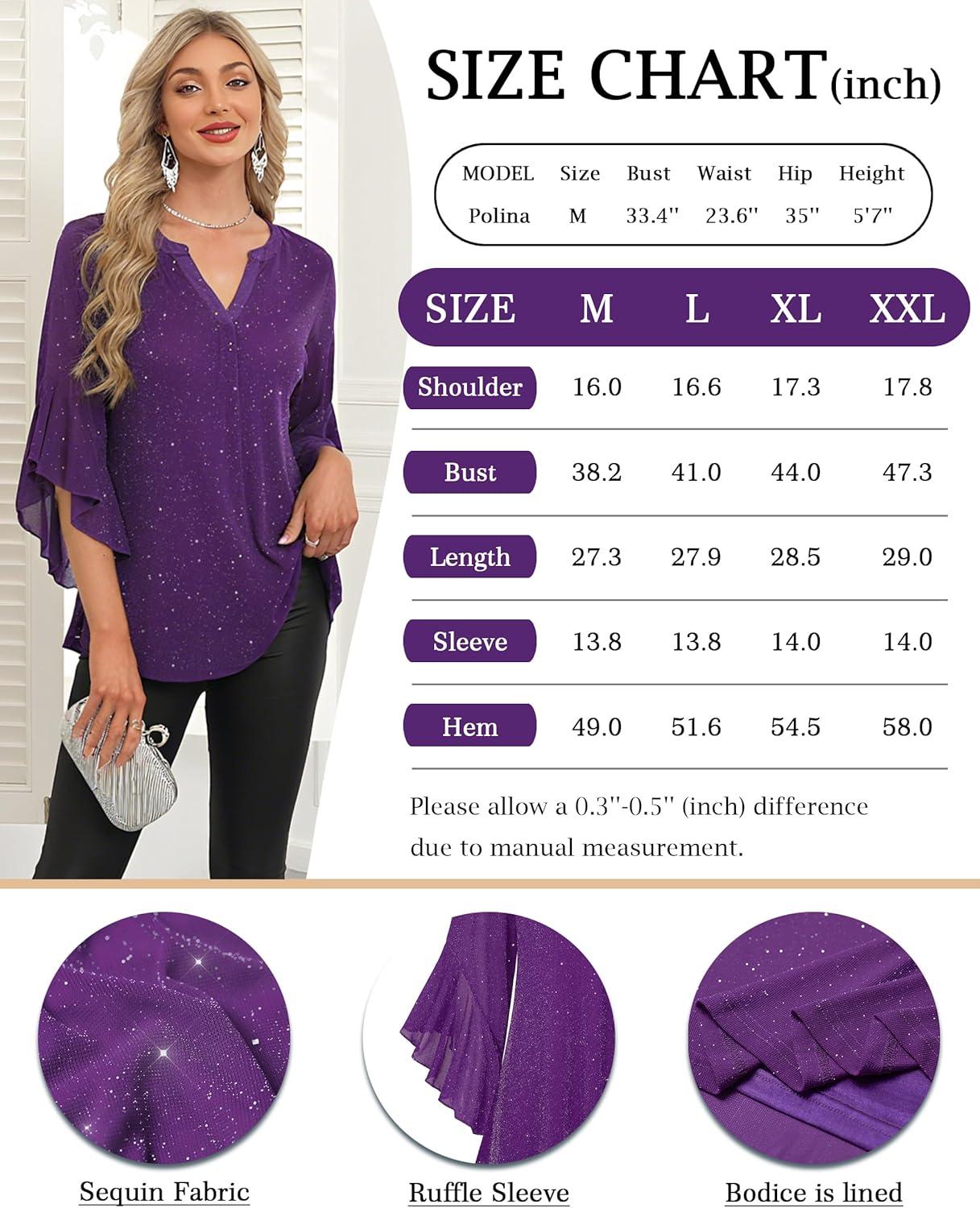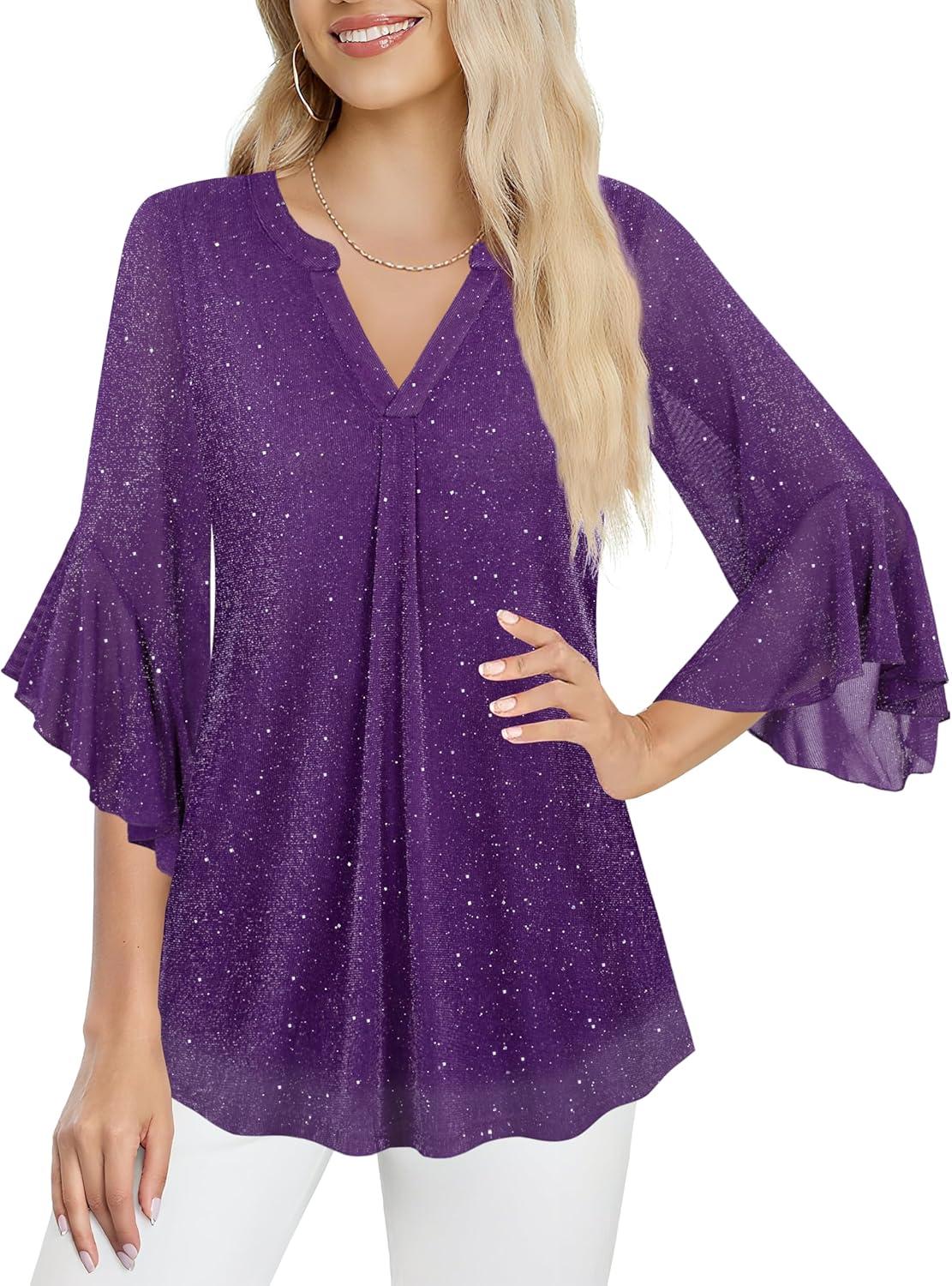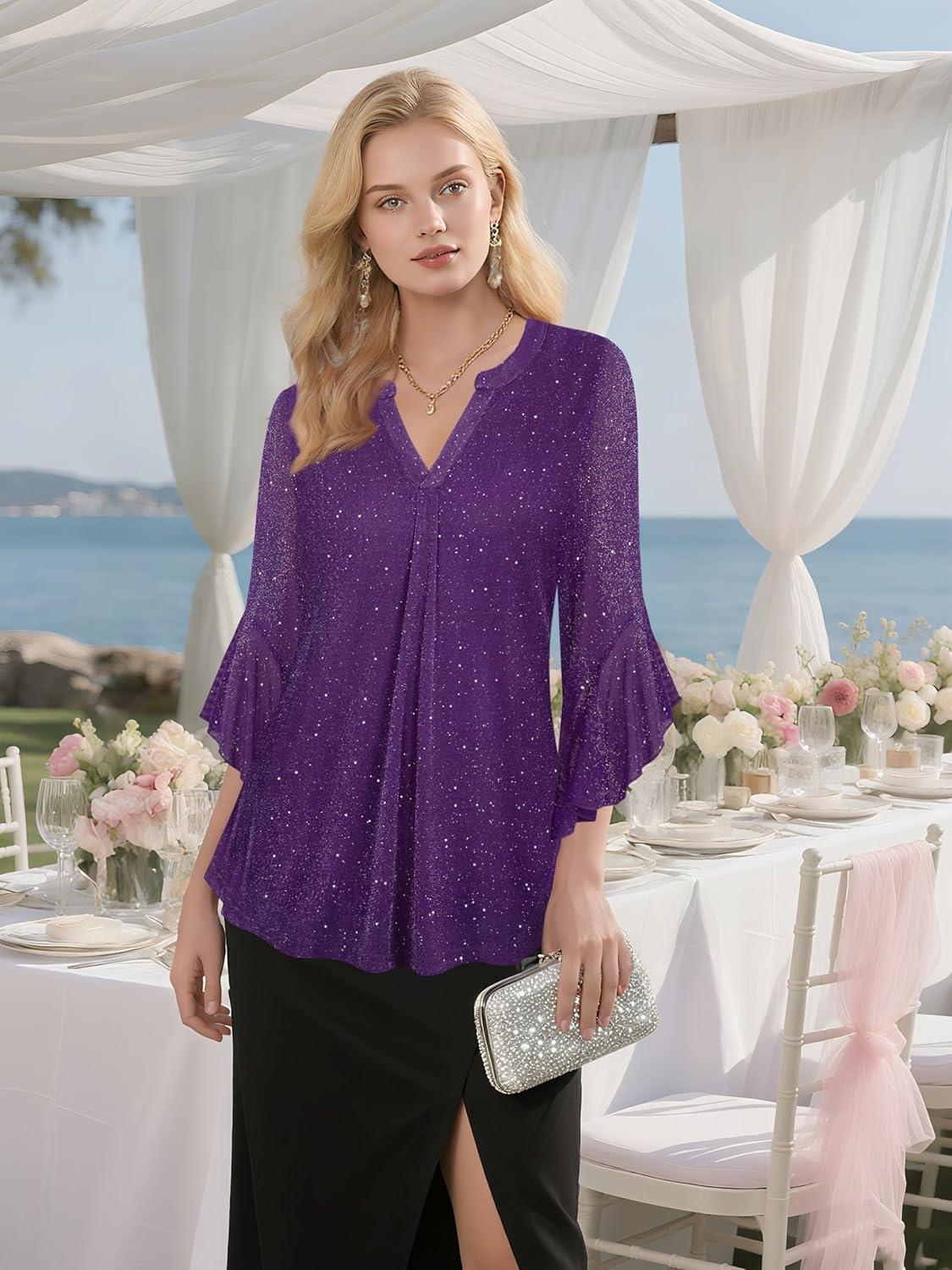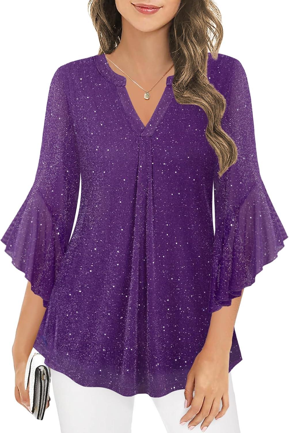 Ninedaily Womens Tops 3/4 Sleeve Dressy Casual Blouses Double Layers V Neck Shirt(Sparkly Purple)