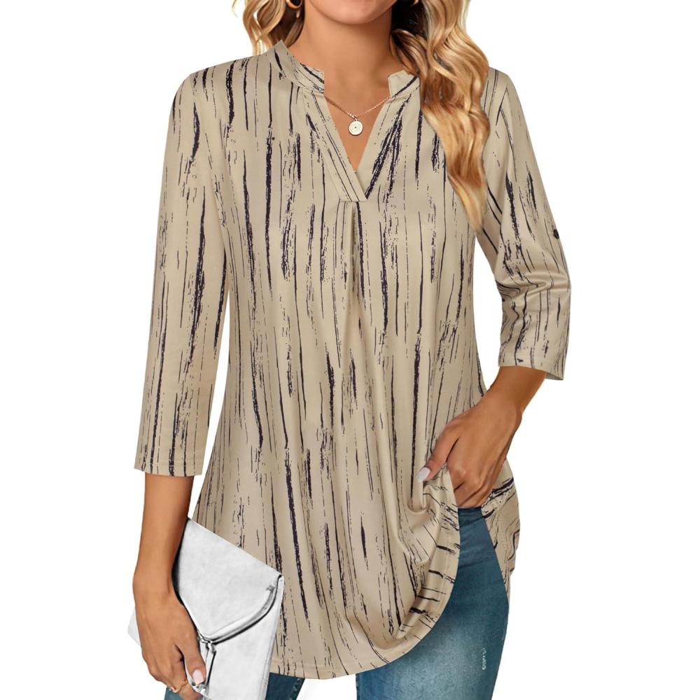 Ninedaily Womens Tops Dressy Casual 3/4 Sleeve V Neck Chiffon Shirt Work Blouses(Beige Stripe)