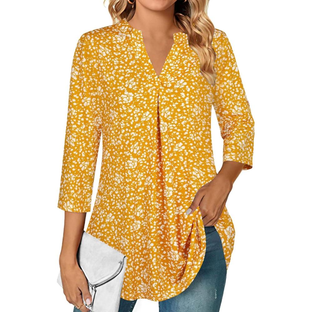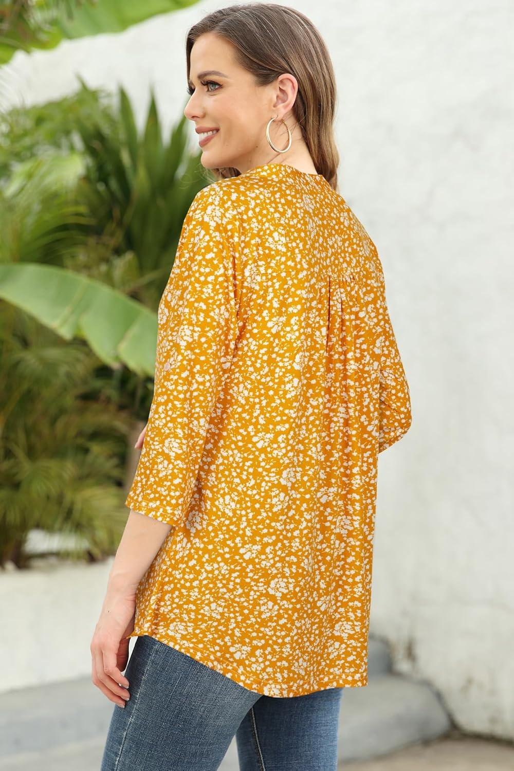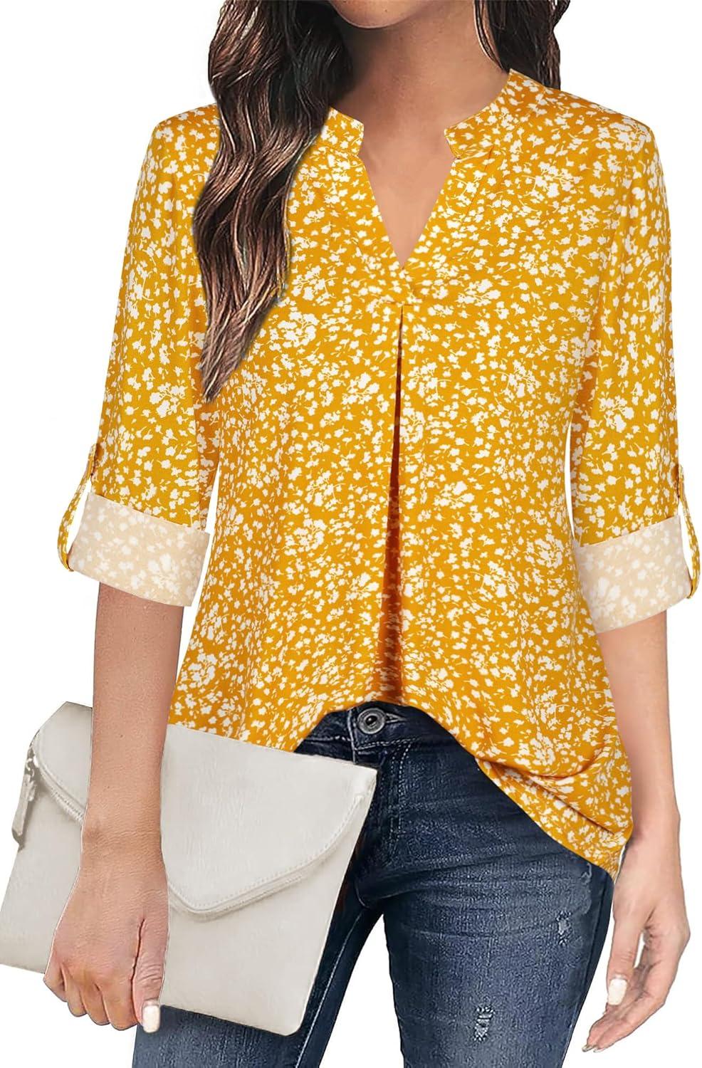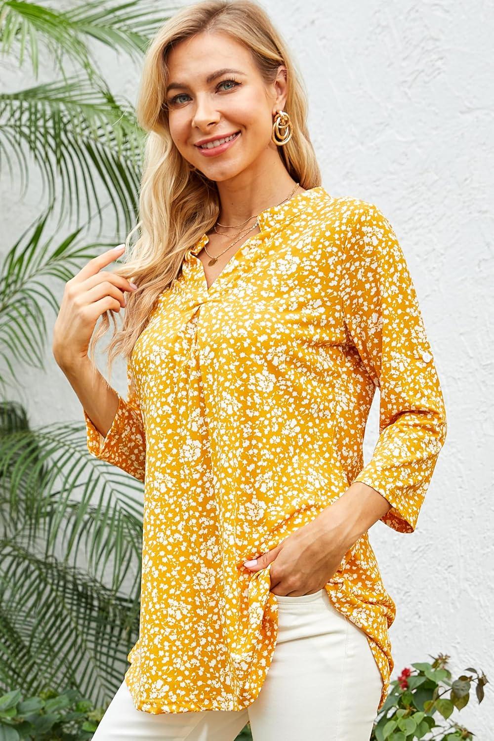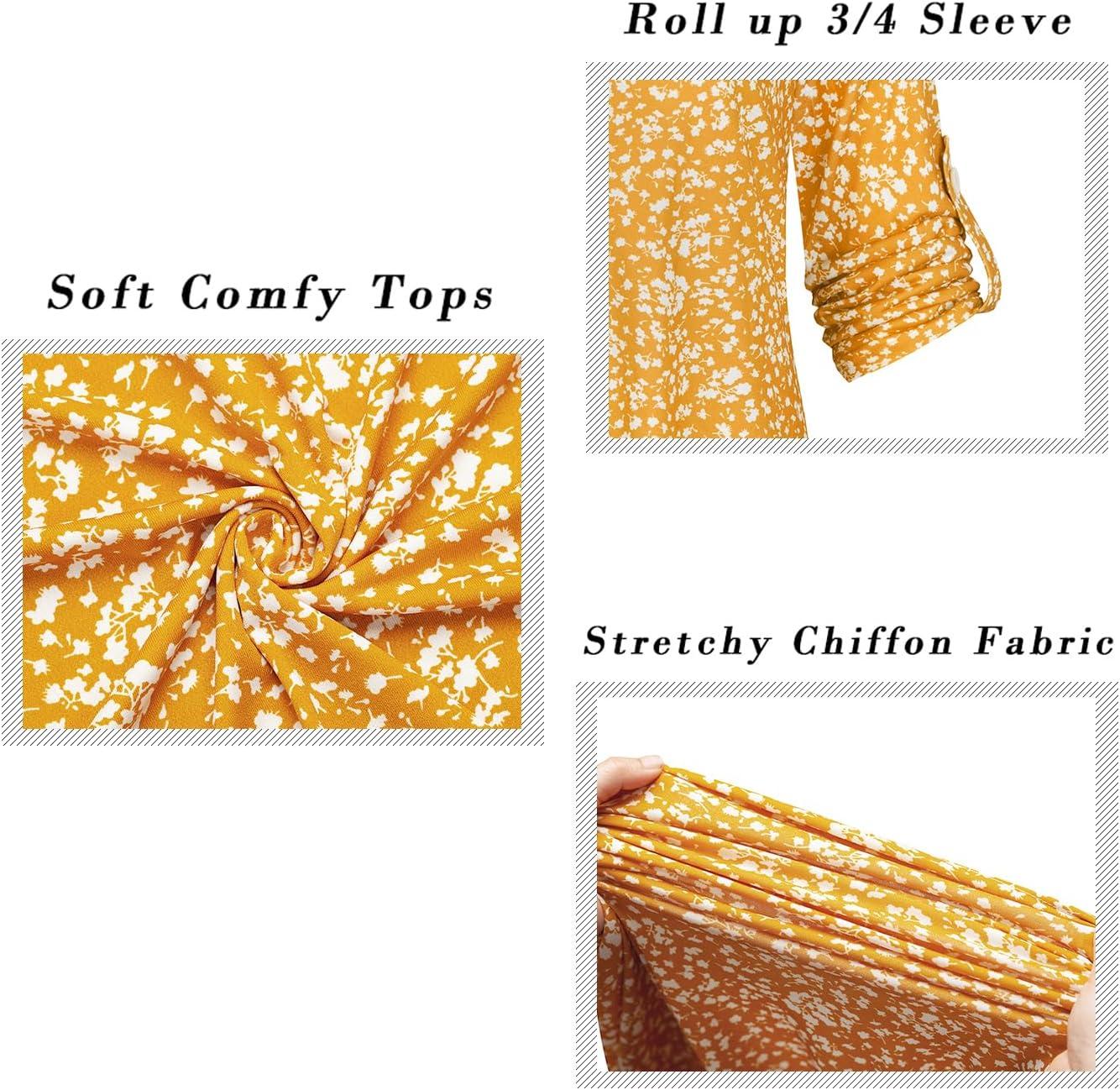 Ninedaily Womens Tops Dressy Casual 3/4 Sleeve V Neck Chiffon Shirt Work Blouses(Z-yellow Floral)